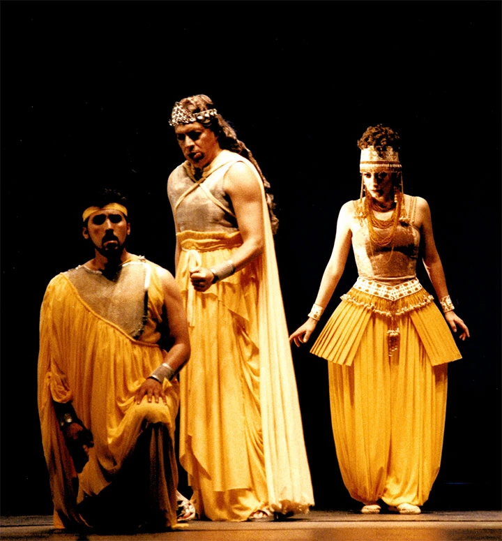 Francisco Araiza en el papel epónimo de la ópera Idomeneo, re di Creta de Mozart, con Héctor Sandoval (Idamante) y Lourdes Ambriz (Ilia) en la puesta en escena de Sergio Vela. Palacio de Bellas Artes, México, 1998. Fotografía: Ernesto Lehn.