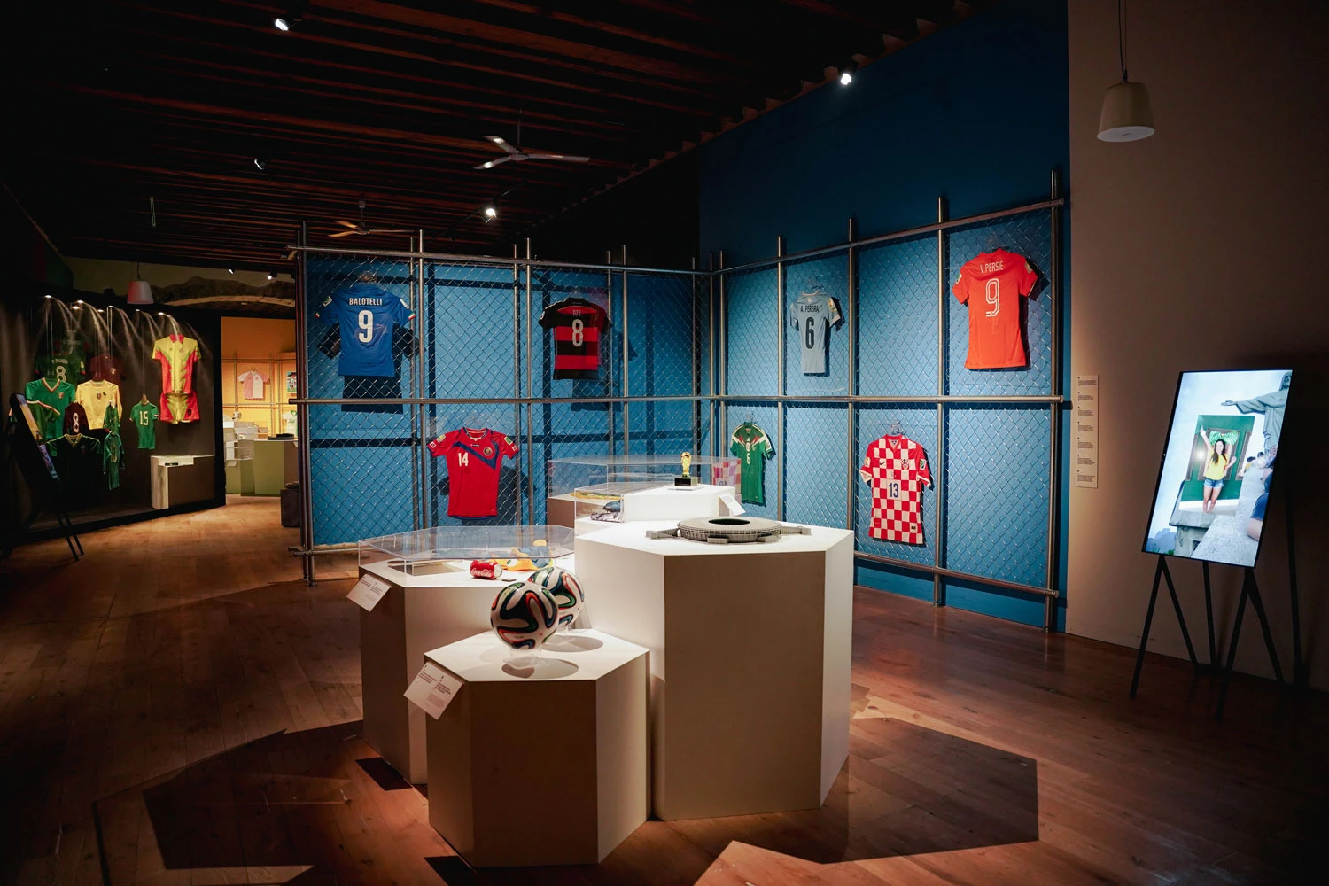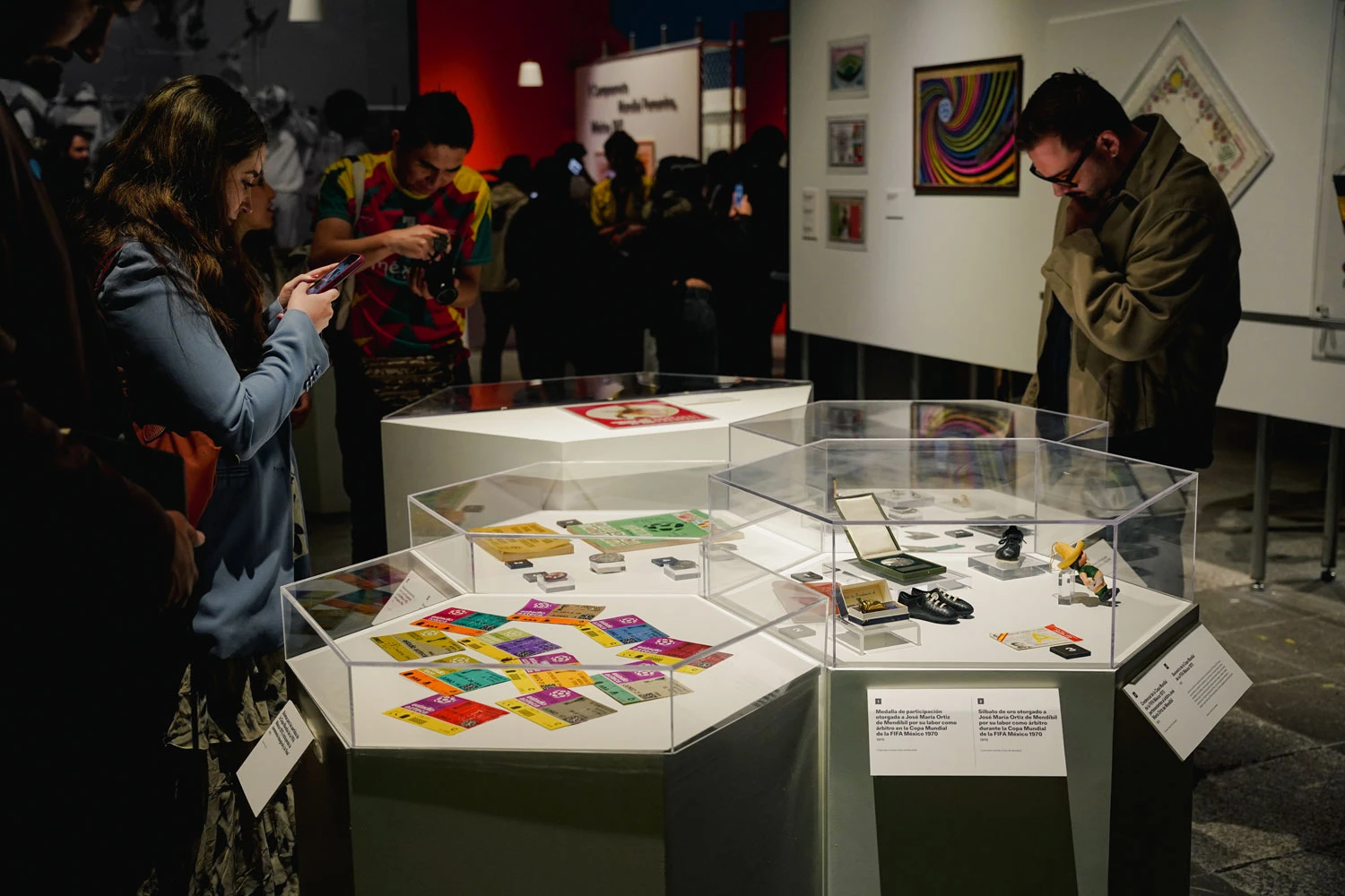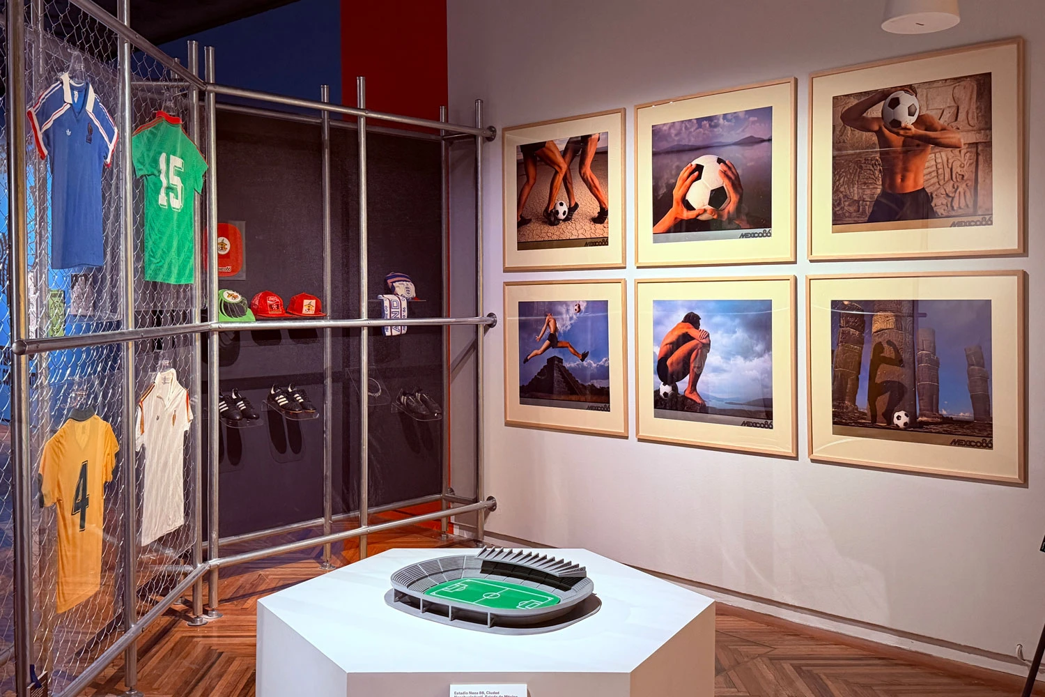 A medida que avanza la exposición, avanza también la tecnología y en la sección dedicada a México 1970 es donde más se nota. Fue el primer Mundial transmitido por satélite y el primero en emitirse a color en Europa. El Adidas Telstar, balón oficial de ese torneo que hoy reconocemos como el símbolo universal del fútbol, fue diseñado con paneles hexagonales blancos y negros precisamente para verse mejor en televisión en blanco y negro. México 1970 también fue el primer mundial en tener una identidad visual completa para un Mundial con un logo, tipografía y mascota, influenciados por el op art y por la misma tipografía que Lance Wyman había diseñado para los Juegos Olímpicos de 1968, también con sede en México.