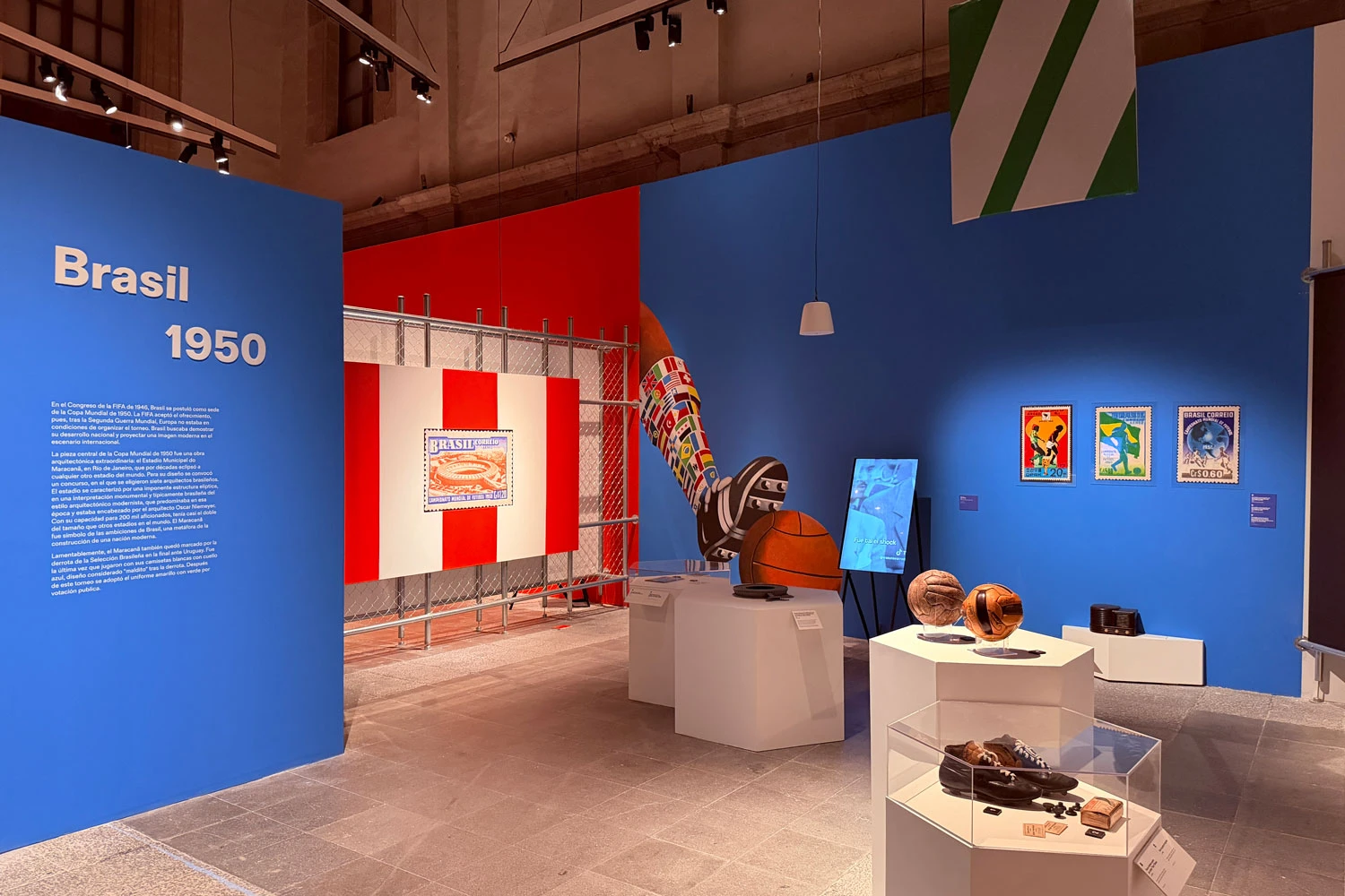 La exposición arranca en Uruguay 1930, el primer Mundial de la historia. Que haya sido ahí no fue casualidad. El país había ganado las medallas olímpicas de oro de 1924 y 1928 y quería celebrar el centenario de su independencia demostrando al mundo que era una nación moderna y progresista. Construyó el estadio Centenario, que en ese momento era el más grande del mundo fuera del Reino Unido. Desde su primera Copa Mundial, el fútbol fue también un acto político.