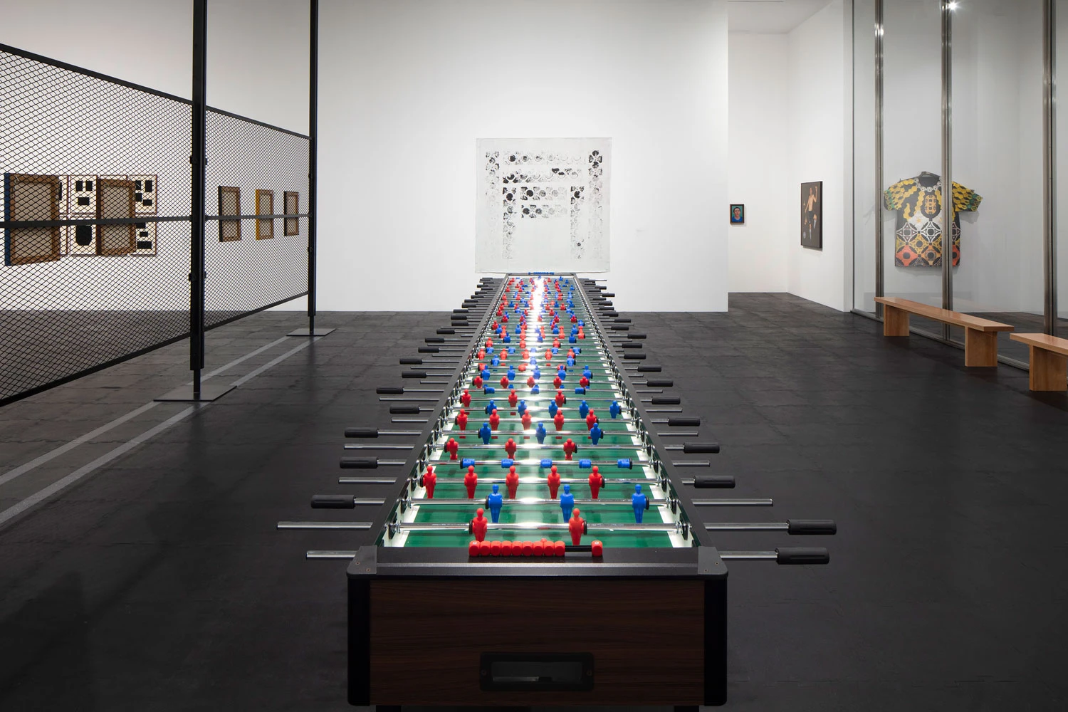 Una de las obras que más me impactaron fue el video del belga Francis Alÿs. Solemos pensar que lo mínimo necesario para jugar fútbol es un balón, pero en esta pieza un grupo de niños en Mosul, Irak, juega con una pelota invisible. Esto se debe a que, bajo el control del Estado Islámico entre 2014 y 2017, los juegos con pelotas estaban prohibidos, lo que obligaba a los niños a reinventar el juego. Aun así, corren, celebran y compiten como si el balón estuviera ahí. En la sala donde se proyecta este video hay unas gradas que invitan a sentarse colectivamente, como si se tratara de asistir a un “verdadero” partido, un detalle sencillo pero muy bien pensado pues da a ese partido fantasma toda la sustancia de un partido normal, una experiencia inmersiva que es un sensible tributo a esos niños iraquíes.